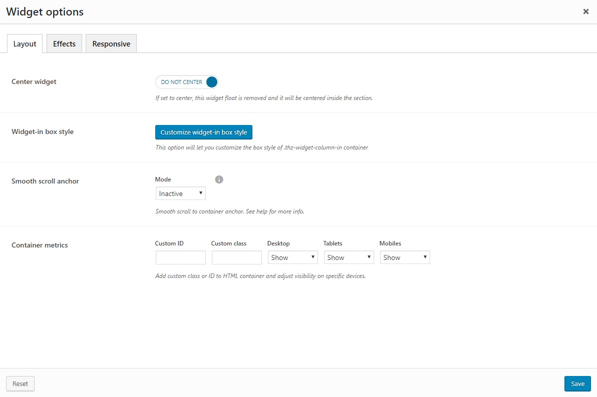 - Center widget - If set to center, this widget float is removed and it will be centered inside the section.